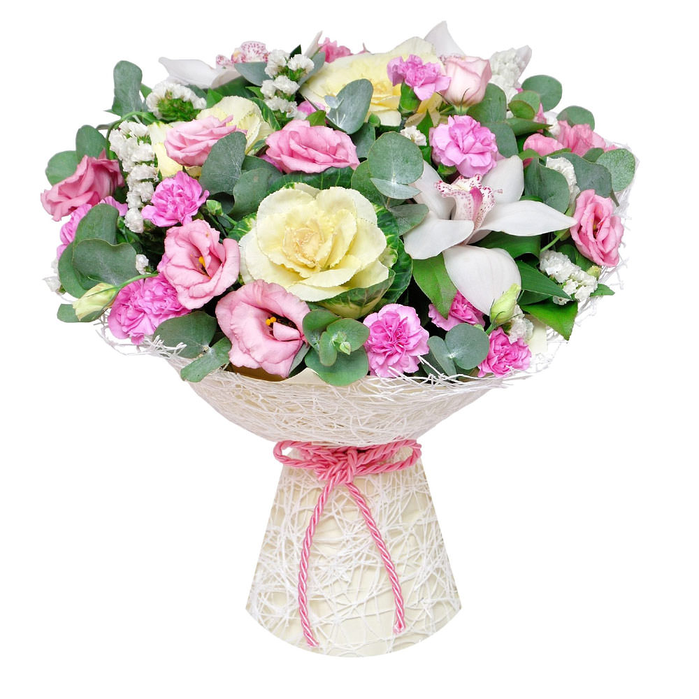На фото представлен образец. Объем букета зависит от выбранного вами размера. Точное количество цветов и цветовую гамму вы можете уточнить у менеджера по телефону.