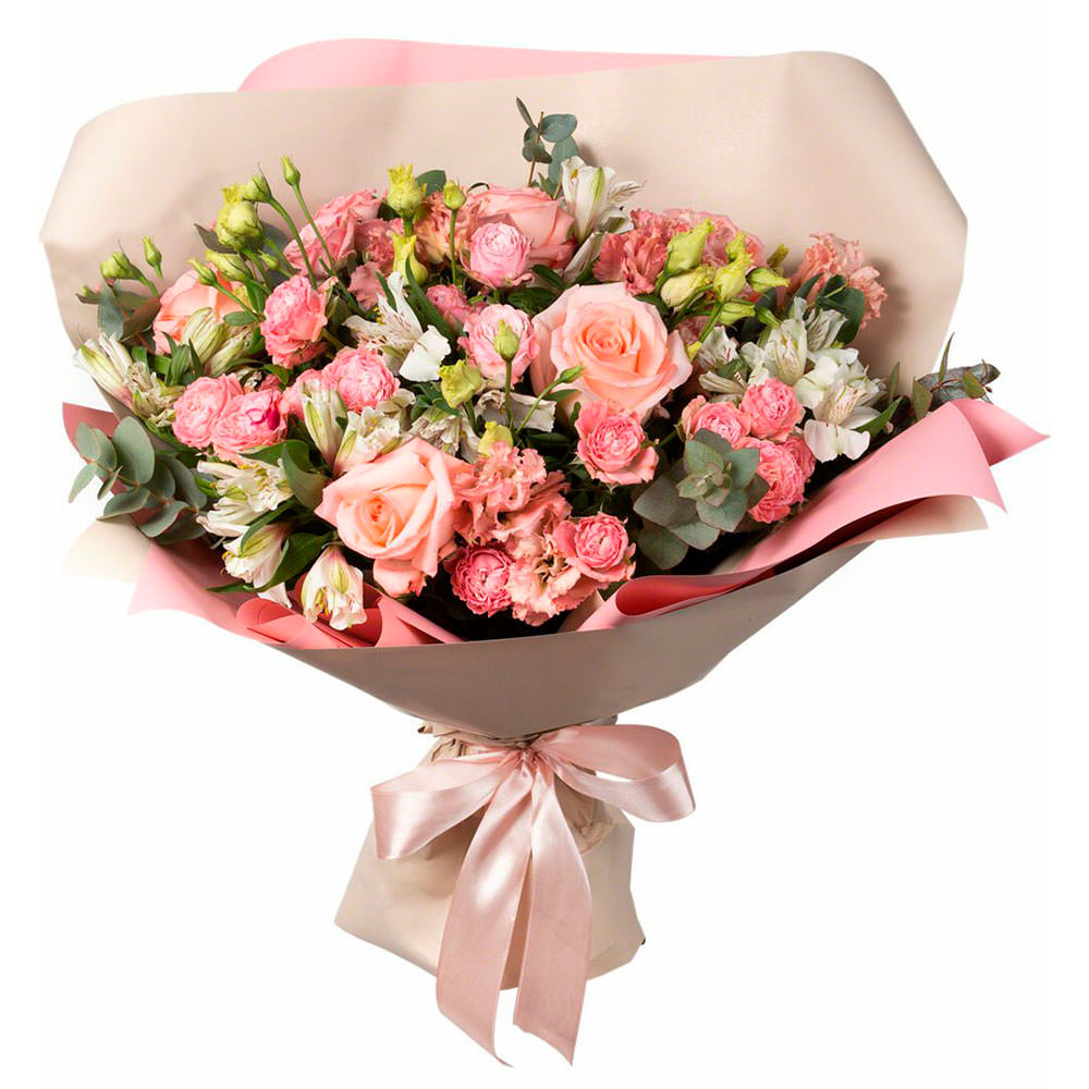 На фото представлен образец. Объем букета зависит от выбранного вами размера. Точное количество цветов и цветовую гамму вы можете уточнить у менеджера по телефону.